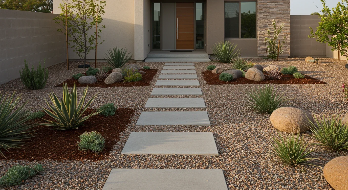 Think of a pathway of soft, crunching gravel leading from your driveway to the front door, bordered by neat mulch edges and ornamental grasses swaying in the breeze.